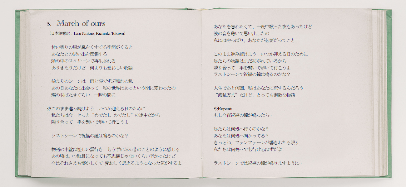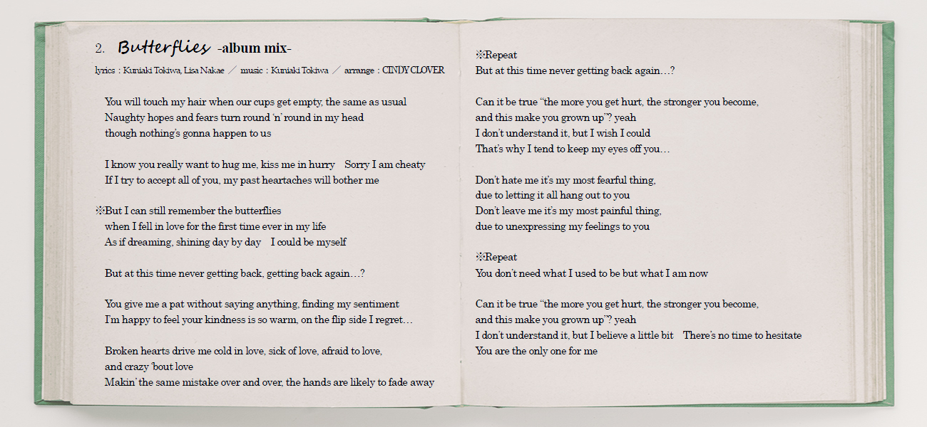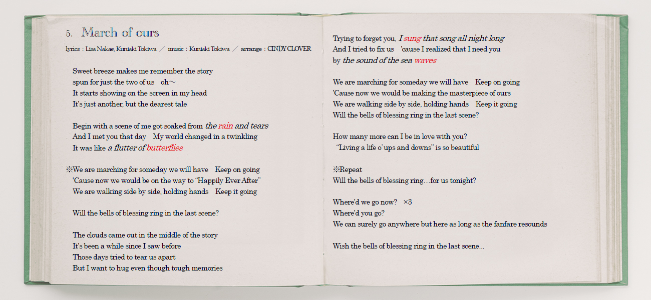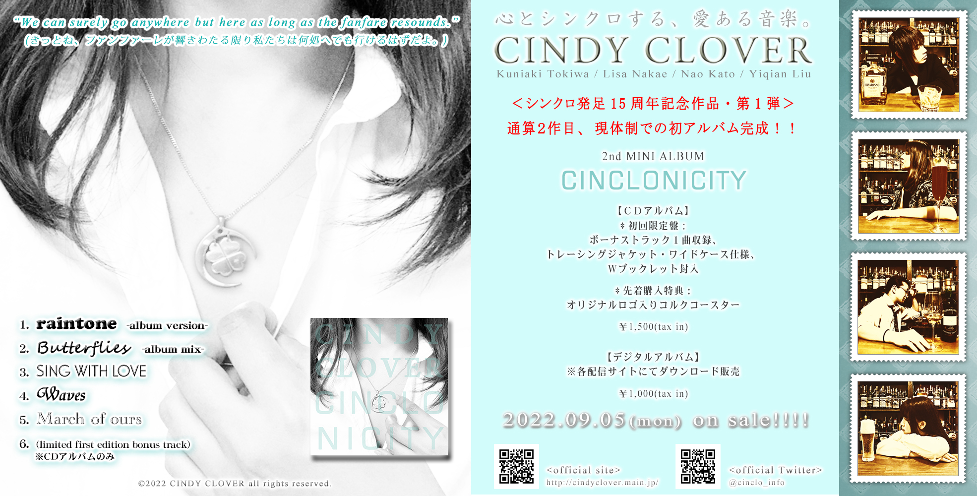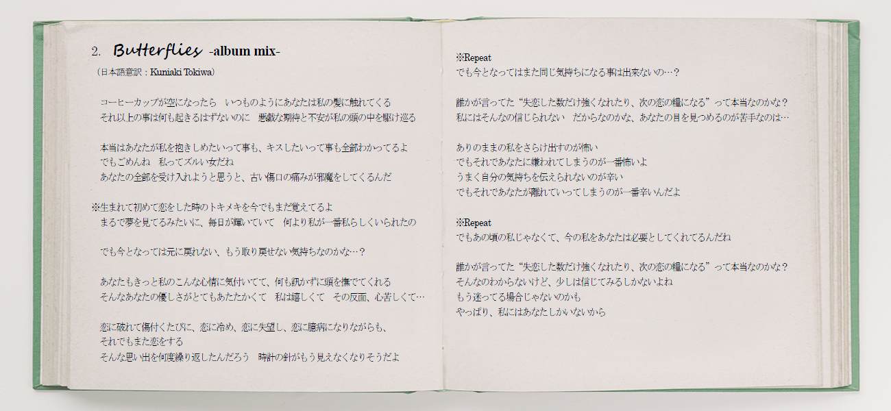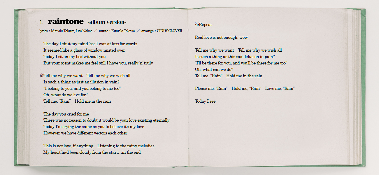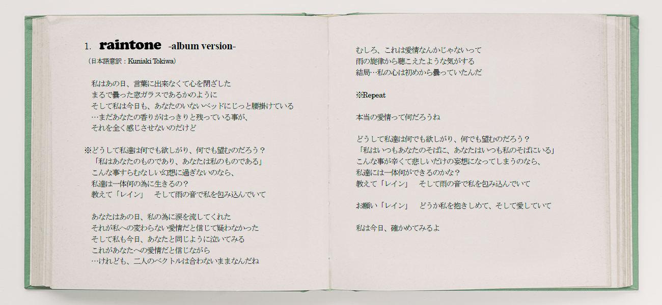 <収録曲> 1. raintone -album version- [lyrics] | [日本語意訳] 2. Butterflies -album mix- [lyrics] | [日本語意訳] 3. SING WITH LOVE [lyrics] | [日本語意訳] 4. Waves [lyrics] | [日本語意訳] 5. March of ours [lyrics] | [日本語意訳] 6. (limited first / regular edition bonus track) ※CDアルバムのみ 【CDアルバム】 *初回限定盤: ボーナストラック1曲収録、 トレーシングジャケット・ワイドケース仕様、 Wブックレット封入 ¥1,500(tax in) *通常盤: ボーナストラック1曲収録 ¥1,200(tax in) 【デジタルアルバム】 ¥1,020(tax in) ※各配信ストアにてダウンロード販売中 >>リンク先はこちら<<